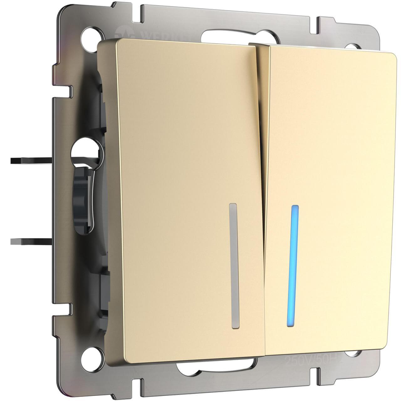 Выключатель двухклавишный с подсветкой Werkel шампань W1120111 4690389157097 — купить в интернет-магазине Влюстре по цене 935 ₽ руб. с доставкой по Москве, Московской области и по всей России.