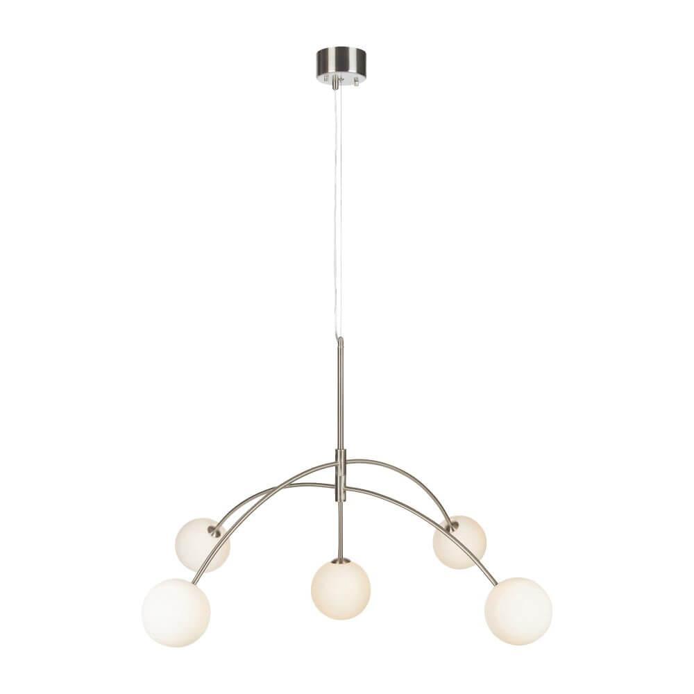 Подвесная люстра Markslojd Heaven 107559 из линейки Heaven от шведского бренда Markslojd будет отлично смотреться в интерьере кухни в современном стиле. У люстры 5 ламп с цветовой температурой 2800K. Для Markslojd 107559 подойдут галогеновые лампы с цоколем G9 (лампочки идут в комплекте), а общая мощность 140 Вт позволяет осветить площадь до 7 м². Арматура выполнена из металла матово-никелерованного цвета, а плафоны из стекла белого цвета. Размеры модели 700 мм, диаметр 1170 мм. Регулярные скидки в магазине Влюстре.